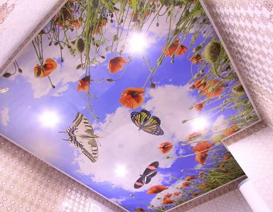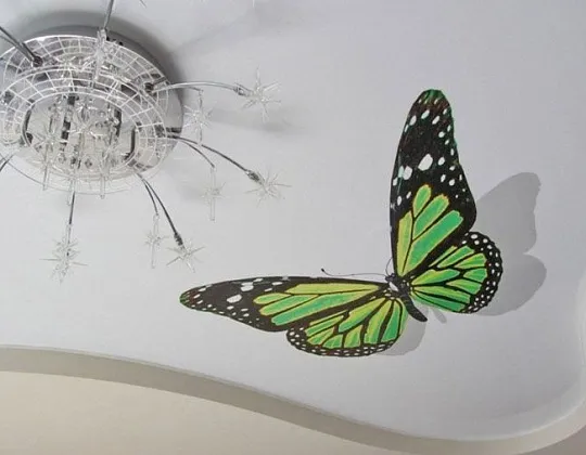 В каталог вошли 3Д изображения всех цветов и размеров. Здесь вы можете найти подходящий рисунок. Это могут быть бабочки, которые сидят на цветах, ветках, порхают в воздухе. Их можно расположить как по всему полотну, так и для декорирования угла и вокруг люстры.
